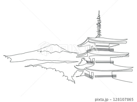 富士山と五重塔、新倉山浅間公園 一筆書き Yamanashi, Japan