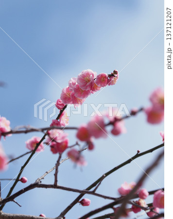 青空背景に咲くピンクの梅の花 春のイメージ 縦構図 コピースペース