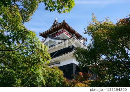 日本庭園の木々に囲まれた清州城