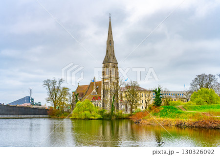 Urban park. Spring in Copenhagen, Denmark. Langelinie park near St. Alban's Church.