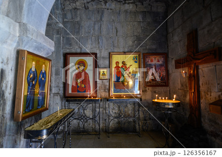 Interior of the Gergeti Trinity Church near Stepantsminda, popular tourist destination in the Caucasus in Georgia