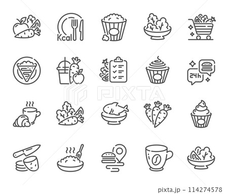 Healthy food line icons. Salad with arugula, Cook meal and Diet menu set. Crepe, popcorn food and porridge line icons. Healthy carrots vegetable, fast food delivery and Kcal menu. Vector