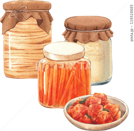 Three jars of pickles with kombucha, kefir, and carrots, alongside a plate of kimchi, hand-drawn watercolor illustration