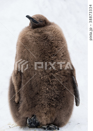 キングペンギンのヒナ 雪背景 (旭山動物園)