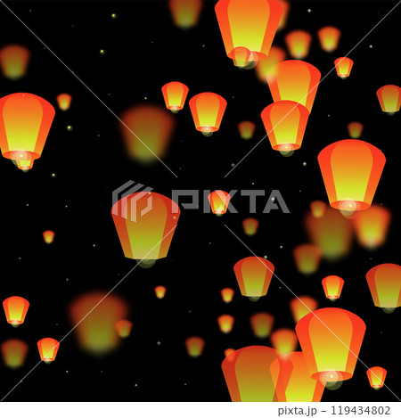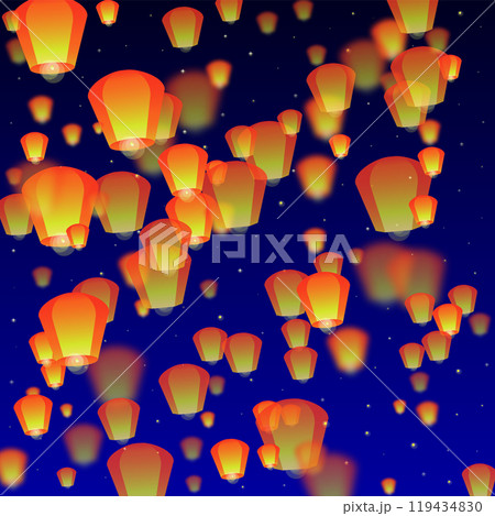 Sky lanterns floating in the night sky. Thailand holiday with paper lantern lights flying in the night sky. Sky lantern festival celebration. Vector illustration on black background.