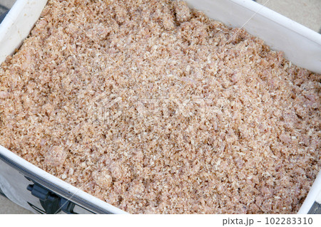 パン粉主体の沖アミと配合剤を混ぜ込んだ磯上物釣り用のコマセが入った白いバッカン(斜めアングル画像)