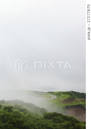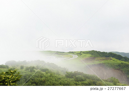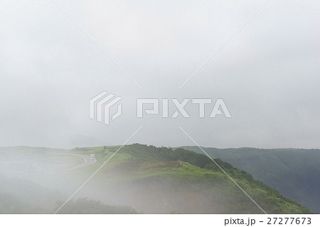 阿蘇ミルクロードの濃霧新緑の峠道早朝に霧に覆われ始める