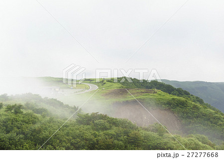 阿蘇ミルクロードの濃霧新緑の峠道早朝に霧が発生