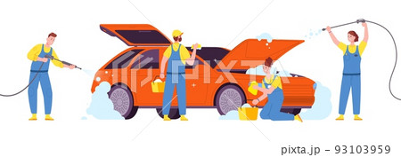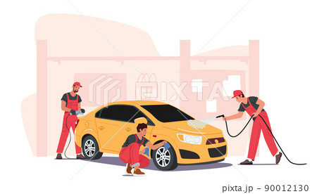 People washing car. Employees cars wash company cleaning dirty vehicle with high pressure water hoses on yard or carwash garage, cartoon auto cleaners, splendid vector illustration