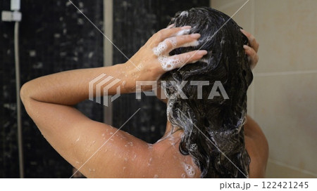 Personal grooming with warm water care, Relaxing morning shower with bubbly hair washing session, Closeup of sudsy hair being gently massaged during daily cleansing