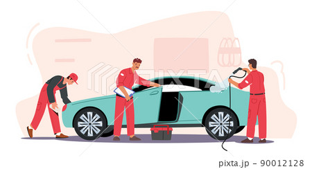 Car Wash Service Concept. Cleaning Company Employees Male Characters Working Process. Workers Wear Red Uniform