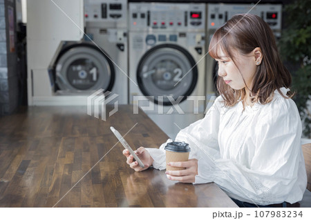 コインランドリーで洗濯が終わるのを待つ若い女性