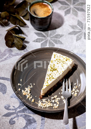 Raw vegan cheesecake with lime zest and cashew nuts on plate