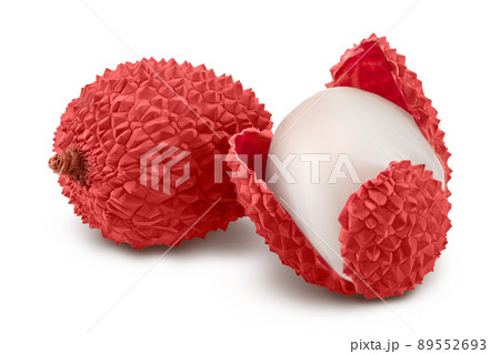 Pink or red lychees and cut of lychee isolate. Flesh ripe lychee and half of lychee with clipping path.