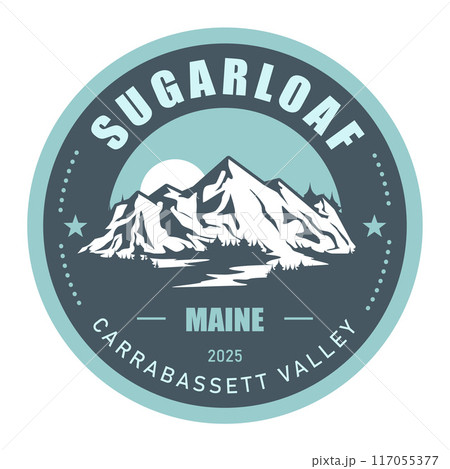 Sugarloaf, Maine, Longfellow Mountains ski resort stamp, emblem with snow covered mountains, vector