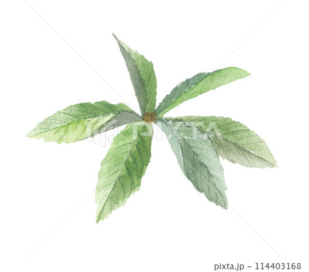 完熟前のビワの幼果 枝葉付【水墨画風水彩イラスト】果物 フルーツ 白バック PNG 素材