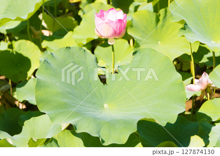 奈良県の藤原京跡にある蓮池に蓮の花が咲いています。学名はNelumbo nuciferaです。
