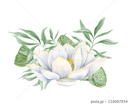 White Nymphaea flower with seed pod heads, green leaves watercolor realistic illustration. Waterlily and eucalyptus branches hand painting composition. For wedding greeting, poster