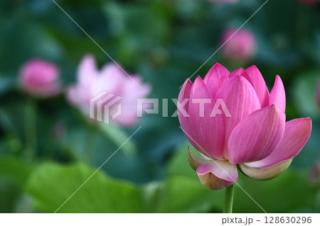 夏の早朝の池に美しく咲くピンク色のハスの花のクローズアップ