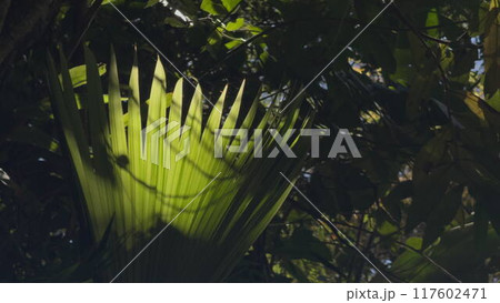Sunlight filtering through a lush green palm leaf