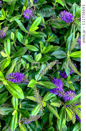Vivid purple hydrangea macrophylla blooms on dark green foliage