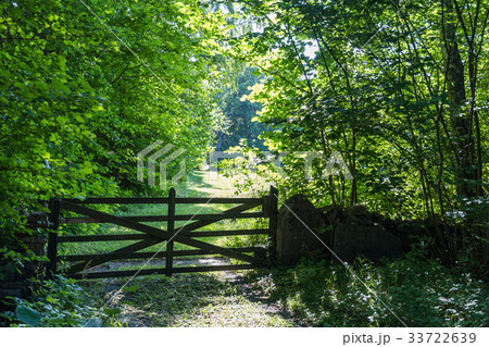 Old wooden gate in a lush greenery