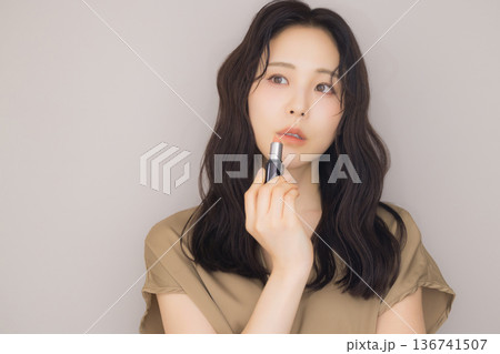 メイクをする若いアジア人女性(口紅・ルージュ・グロス・リップ)