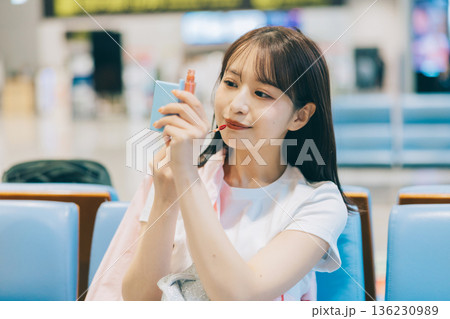 空港でメイクを直す女性 「撮影協力:関西国際空港(KIX)」
