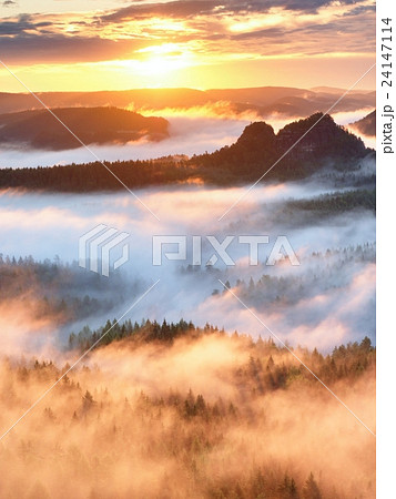 Marvelous daybreak above valley full of mist.