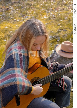 Blonde woman playing string guitar outdoors in autumn forest. Concept of sound therapy, mental health and wellness rituals. Calmness tranquility audio-sensory practices. Aura farming energy