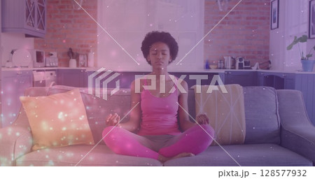 Image of light spots over african american woman practicing yoga and meditating at home