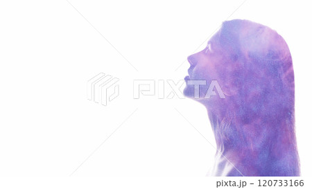 Esoteric portrait. Spiritual enlightenment. Purple mist in female silhouette double exposure isolated on white copy space background.