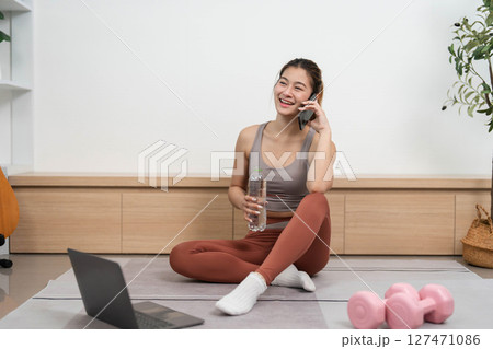 Yoga and Communication. Woman talking on phone while practicing yoga at home.