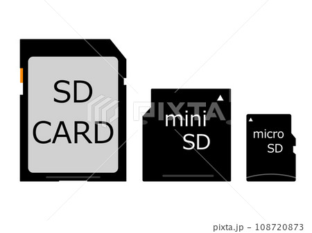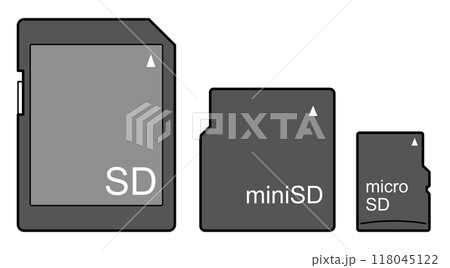3種類のシンプルなSDカード、miniSDカード、microSDカードのイラスト