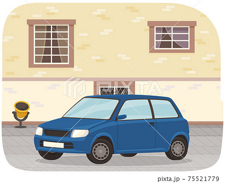 Blue car on city street near the building with brick wall and windows. Modern minicar in cityscape