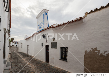 Ancient cobblestone alley with traditional white houses in Monsaraz, walled medieval village in Portuguese Alentejo region near the border with Spain