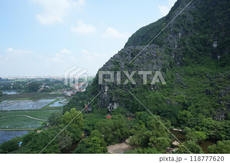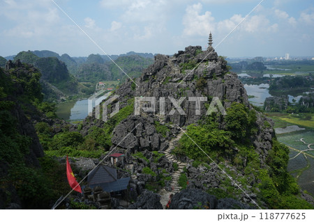 Impressive karst formations and rice paddy fields in Tam Coc with the stone staircase ascending the lying dragon in foreground, Ninh Binh province, Vietnam