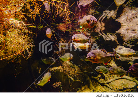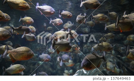 Predatory hungry freshwater red bellied piranha fish swimming in aquarium of oceanarium. Flock of