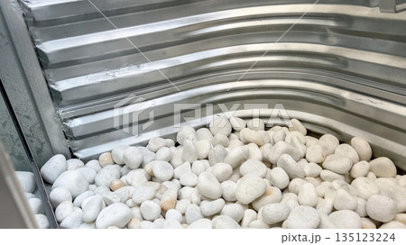 Corner section of a corrugated metal window well filled with small white decorative rocks. The texture of the galvanized steel contrasts with the smoothness of the pebbles under natural daylight.