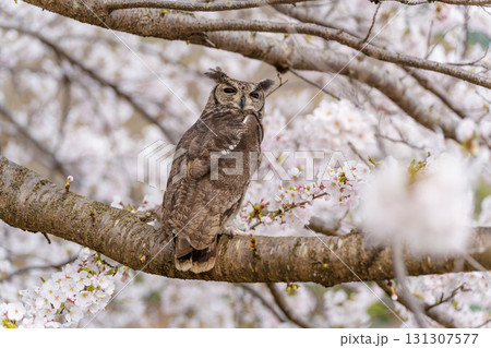 桜の木に止まるフクロウ アメリカワシミミズク