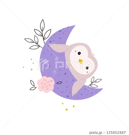 Adorable Sleepy Owl with Purple Moon and Stars Cartoon Vector Illustration for Kids