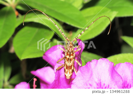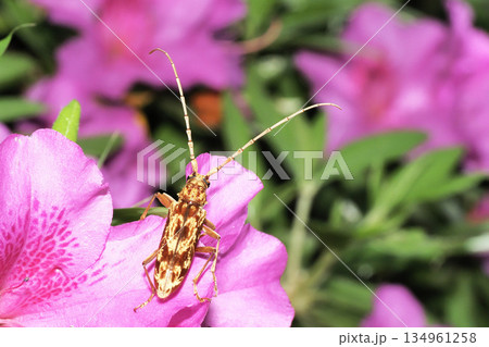ツツジの花に乗るキマダラミヤマカミキリ
