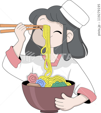 CUTE JAPANESE WOMAN CHEF ENJOYING A BOWL OF DELICIOUS RAMEN NOODLES
