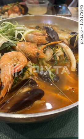 Detailed view of Korean seafood noodle soup with shrimp, mussels, and vegetables in a rich spicy broth.