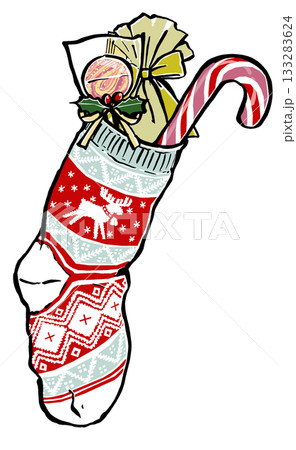 キャンディが詰まったノルディック柄のクリスマスの靴下 筆描き・2色塗り