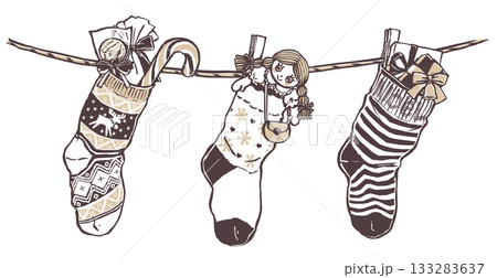 赤い縞の紐にぶら下げられたいろいろなプレゼントの入った3種類のクリスマスの靴下 版画風