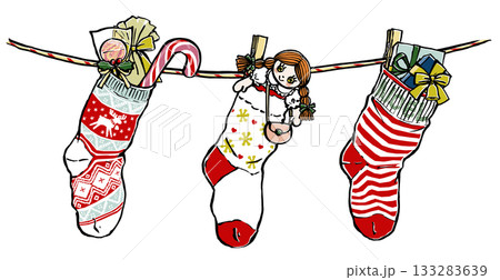 赤い縞の紐にぶら下げられたいろいろなプレゼントの入った3種類のクリスマスの靴下 筆描き・マット塗り