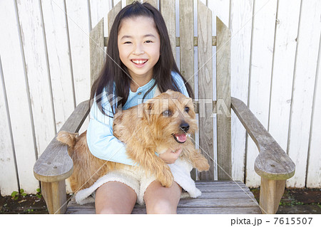 木製の椅子に座りノーフォークテリアを抱く女の子