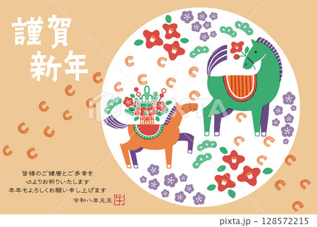 2026年 午年年賀状イラスト(馬の親子と華やかなお正月)