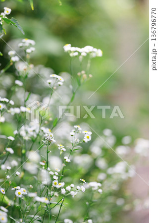 柔らかなボケに包まれた白い小花と緑のナチュラル背景
